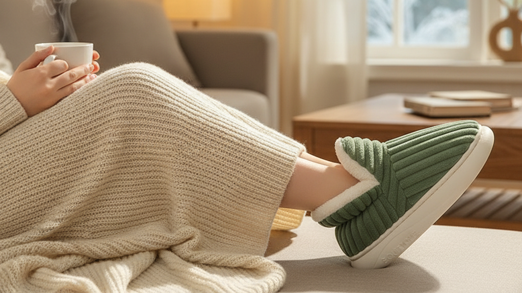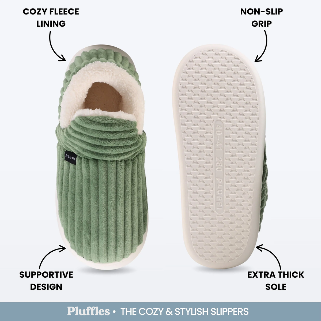 Pluffles™ features a cozy fleece lining, a supportive fit, and a non-slip, thick sole for warm and secure steps at home.